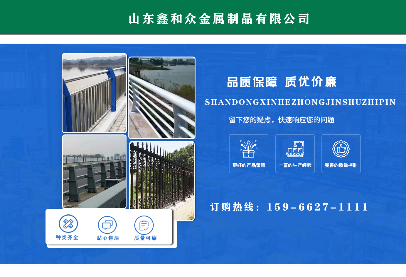 山東鑫和眾金屬制品有限公司主要產(chǎn)品有防撞護欄,橋梁護欄,道路護欄,河道護欄,不銹鋼護欄等護欄。提供設(shè)計方案,一站式定制,包您滿意價格優(yōu)惠,歡迎來電咨詢! 公司常年從事銷售護欄防撞護欄,橋梁護欄,道路護欄,河道護欄,不銹鋼護欄,橋梁鋼護欄,河道燈光護欄等。產(chǎn)品廣泛應(yīng)用于橋梁、河道、旅游景區(qū)、道路、公路、公園、小區(qū)、景觀、道路防撞等領(lǐng)域?! 」井a(chǎn)品均采用優(yōu)質(zhì)不銹鋼材料,符合相關(guān)標(biāo)準。各種型號不銹鋼復(fù)合管及護欄,質(zhì)量嚴格把控。產(chǎn)品強度高、耐腐蝕、焊接牢固、抗沖擊、性能好,防撞護欄結(jié)構(gòu)簡單、美觀實用大方?! g迎前來訂購!...